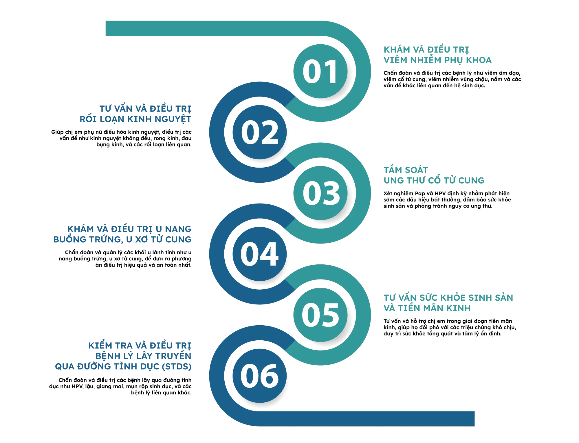 Chẩn đoán và điều trị các bệnh lý như viêm âm đạo, viêm cổ tử cung, viêm nhiễm vùng chậu, nấm và các vấn đề khác liên quan đến hệ sinh dục.